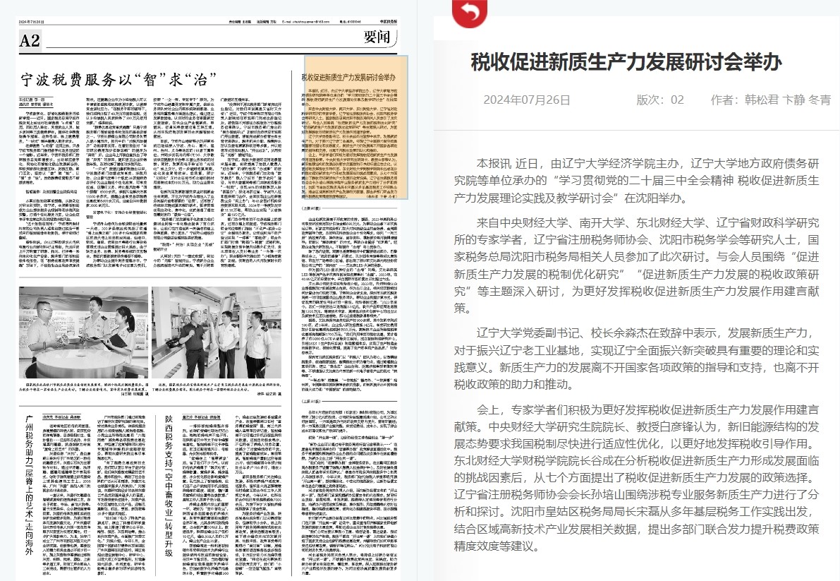 2024年7月26日,《中国税务报》以“税收促进新质生产力发展研讨会”为题报道了304am永利集团官网成功举办研讨会的要闻,现将全文转载如下:
