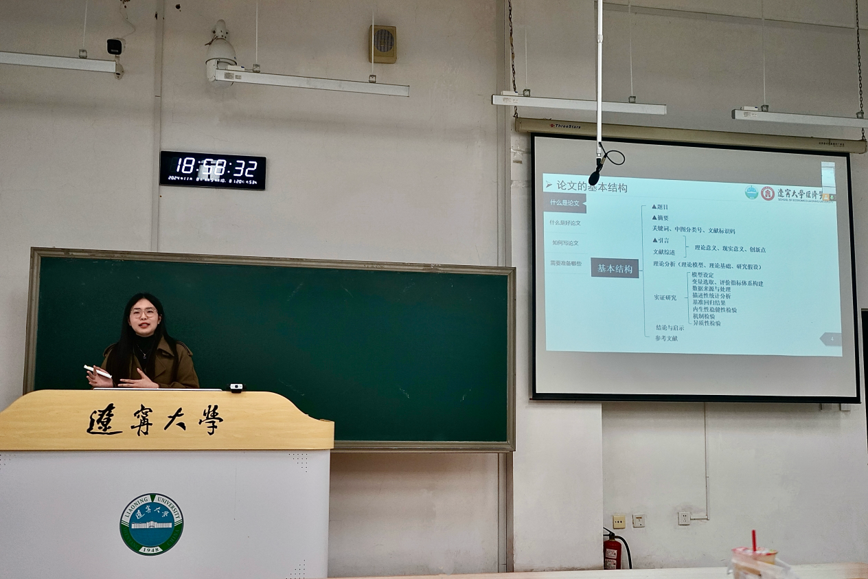 2021级郝雨时同学为同学们分享撰写学术论文的经验。她以“博观而约取,厚积而薄发”作为开头,指明了论文写作的特点。从什么是论文?什么是好论文?如何写论文?写论文还需要准备什么?四个问题作为切入点并一一进行细致入微的解答,并在最后分享了一些实用的论文资源,使同学们受益匪浅。
