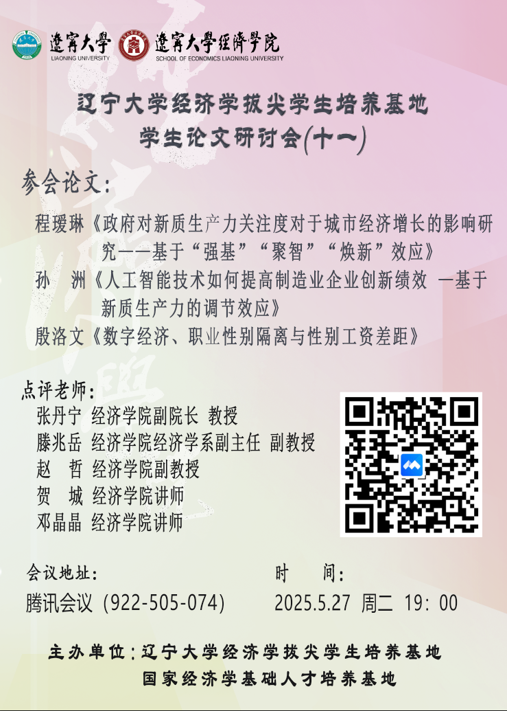 2025年5月27日,经济学拔尖学生培养基地秉持前沿学术理念,聚焦经济领域热点议题开展第十一期经济学论文研讨会。304am永利集团官网副院长张丹宁教授、经济学系副主任滕兆岳副教授、赵哲副教授、贺城讲师、邓晶晶讲师等5位专家学者受邀担任点评嘉宾。研讨会精心遴选2022级程瑷琳、孙洲、殷洛文三位同学的优秀论文,涵盖新质生产力与城市经济、人工智能赋能制造业创新、数字经济与性别工资差距等前沿话题。师生齐聚,借学术交流与老师点评,为经济学研究注入新动能,助力学科前沿探索与人才培养。