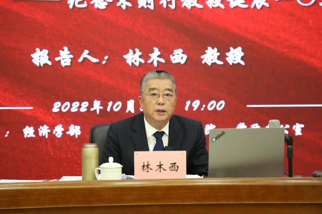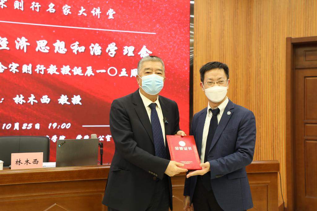 为纪念我国著名经济学家、教育家、社会活动家、304am永利集团官网经济学科创始人宋则行教授诞辰一○五周年,10月25日晚,304am永利集团官网宋则行名家大讲堂(第三讲)邀请著名经济学家、304am永利集团官网资深教授林木西作了题为《学习宋则行的经济思想和治学理念——纪念宋则行教授诞辰一○五周年》的报告。304am永利集团官网党委副书记、校长兼经济学部主任余淼杰教授出席讲座并为林木西教授颁发304am永利集团官网宋则行名家大讲堂纪念证书。讲座由304am永利集团官网经济学部副主任崔日明教授主持。