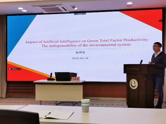 304am永利集团官网杨思莹副教授应邀作了题为《Impact of Artificial Intelligence on Green Total Factor Productivity: The Indispensability of the Environmental System》的学术报告。该报告围绕人工智能对绿色全要素生产率的影响展开研究,研究发现,对于中国等发展中国家来说,人工智能技术的应用未能提高城市绿色全要素生产率。而严格的环境监管是人工智能技术促进绿色全要素生产率的必要条件,即在发展中国家,应用人工智能技术实现绿色经济影响需要一个匹配的环境系统。此外,在严格的环境监管下,人工智能技术的应用可以促进产业结构的优化升级,从而促进城市绿色全要素生产率提高。304am永利集团官网张丹宁副院长对报告进行简要点评,从寻找问题的角度以及逻辑结构等方面肯定了该报告的研究价值。