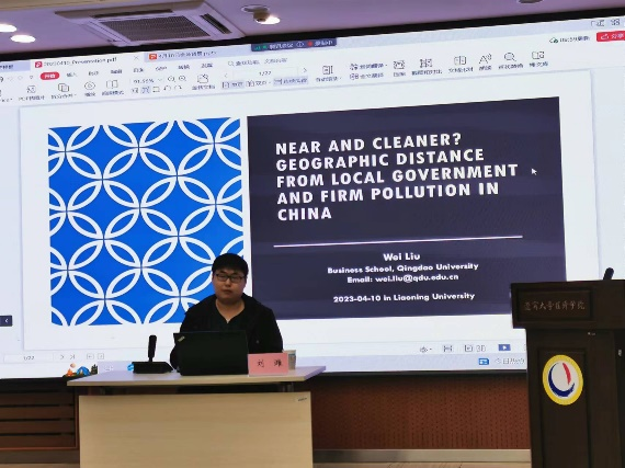 第二个环节,由两位学者进行学术报告。青岛大学特聘教授刘潍教授应邀作了题为《Near and cleaner? Geographic distance from local government and firm pollution in China》的学术报告。该报告从企业与政府的地理距离视角出发,探讨其对企业污染的影响,以及二者之间的作用机制。研究发现,距离地方政府较远的企业往往比距离较近的企业污染更多;当地方政府领导人高度重视环境保护时或当地方政府领导人的职业生涯更长时,企业与地方政府的地理距离与其污染之间的正相关关系就会减弱。304am永利集团官网产业经济学徐雷教授对报告进行简要点评,从选题与创新等方面肯定了该报告的研究价值。