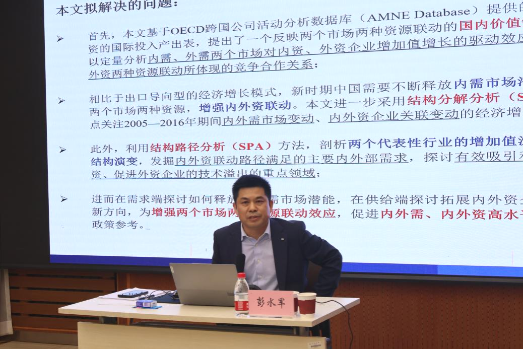 彭水军教授作了题为《内资与外资的共生共赢——基于两个市场两种资源联动的价值链新核算框架分析》的精彩学术报告。该报告依托于彭水军教授发表在管理学国内顶尖刊物《管理世界》2024年第4期的文章。报告使用OECD跨国企业活动分析数据库提供的区分内资和外资的国际投入产出表,提出了一个新的反映两个市场两种资源联动的国内价值链分解框架,定量分析两个市场两种资源的联动特征以及对经济增长的作用机制。研究发现,在面临外部风险和国内经济结构转型的过程中,内需潜力的逐渐释放是内外资实现增加值收益增长的重要支撑,相比外需而言,更具稳定性与可靠性;制造业外资企业倾向于在中国布局封闭式产业链,这一现象在中、高研发强度制造业中更为明显,但内外资合作分工模式占比在持续上升,这反映出内外资“竞争合作关系共存、分工合作逐步深化”的趋势。报告进一步采用结构分解分析(SDA)方法重点分析内外需市场变动、内外资企业关联变动的经济增长效应,结果表明,内需市场的规模扩大与结构优化对于促进内外资经济稳定发展具有重要作用,2010年之后内外资企业关联效应对于外资和内资经济增长的贡献也在逐渐增大,为新时期促进两个市场两种资源的联动和协调发展提供了经验证据。同时,报告结合结构路径分析(SPA)方法,围绕需求侧潜力释放与结构优化以及供给侧国际要素资源流入与内外资联动,探讨了促进两个市场两种资源联动与协调发展的关键增加值流转路径。在互动交流环节,彭水军教授与在场师生们进行了热烈探讨和交流。