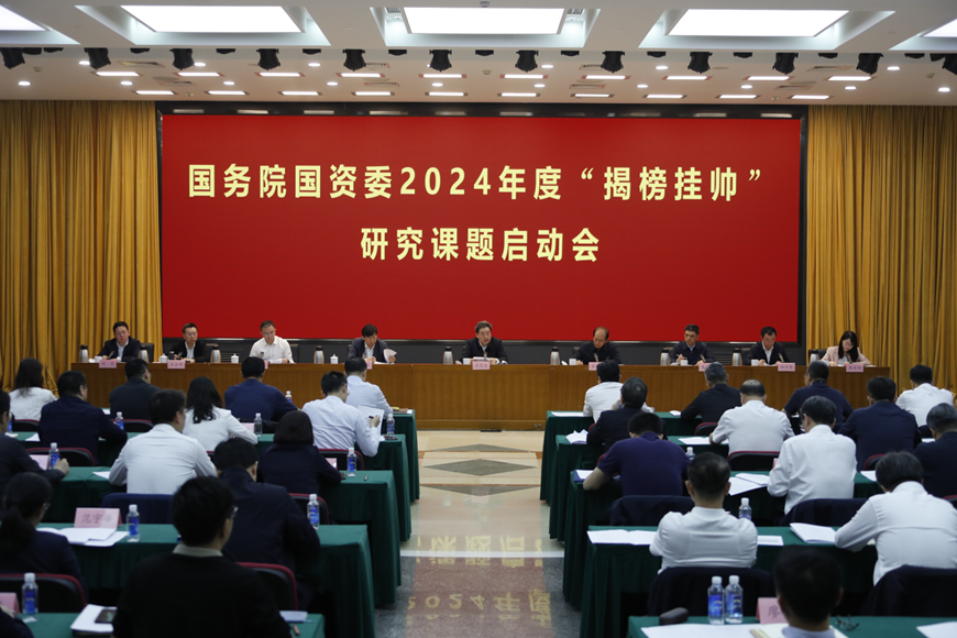 4月26日,国务院国资委2024年度“揭榜挂帅”研究课题启动会在京召开。国务院国资委党委委员、副主任,综合研究工作领导小组组长王宏志出席会议并讲话。会议指出,近年来,国资国企研究工作机制不断完善,研究力量和实力不断增强,研究成果数量和质量不断提升,以高质量研究助力高质量发展的效果更加凸显。新时代新征程国资国企的新使命新定位对理论与实践研究提出了更高要求,要以开展“揭榜挂帅”研究课题为契机,加快建立常态化研究合作机制,充分发挥各承担单位优势,努力将课题研究的“软”成果转化为推动国有企业改革发展的“硬”成效。