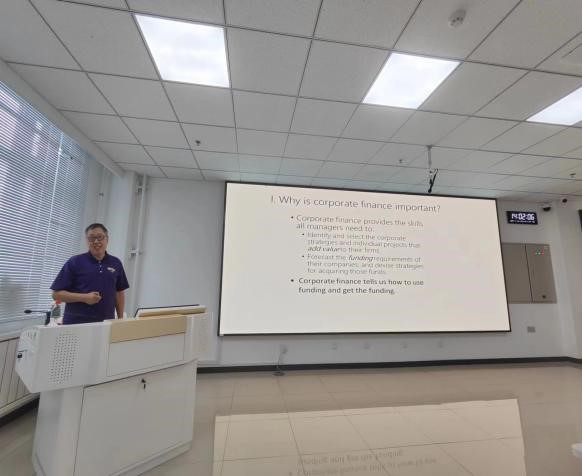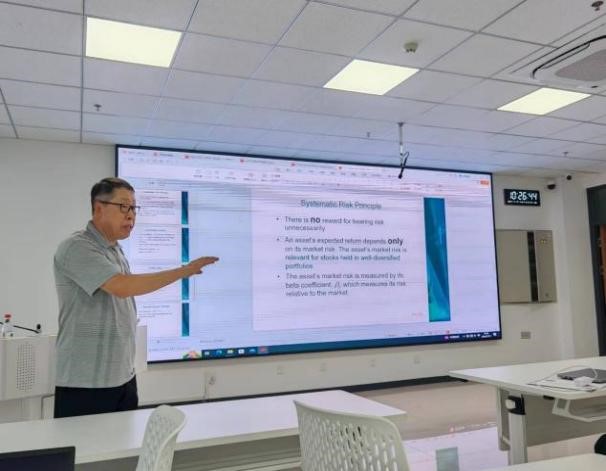 美国北卡州西卡罗莱纳大学的陈海洋教授分两次主讲海外名师课程,课程题目为《International Finance and Corporate Finance》。第一次课程中,陈海洋教授以“Corporate Finance”为切入点,分别为同学们介绍了公司融资的重要性、公司财务管理目标以及公司内在价值的决定因素等多方面内容。在此基础上,第二次授课从“risk and return”方面继续进行分析讲解,通过具体例子,介绍了如何计算股票的风险与预期回报,并通过数据图表得到结论:多元化的投资组合可以有效降低股票的风险,但风险不会被完全消除。整个过程逻辑线条清晰完整,为同学们理解打下坚实基础。在其后的提问环节中,同学们就美国留学、中美教育差异等方面向陈海洋教授提问,陈教授一一解答,拓展学生的海外视野。