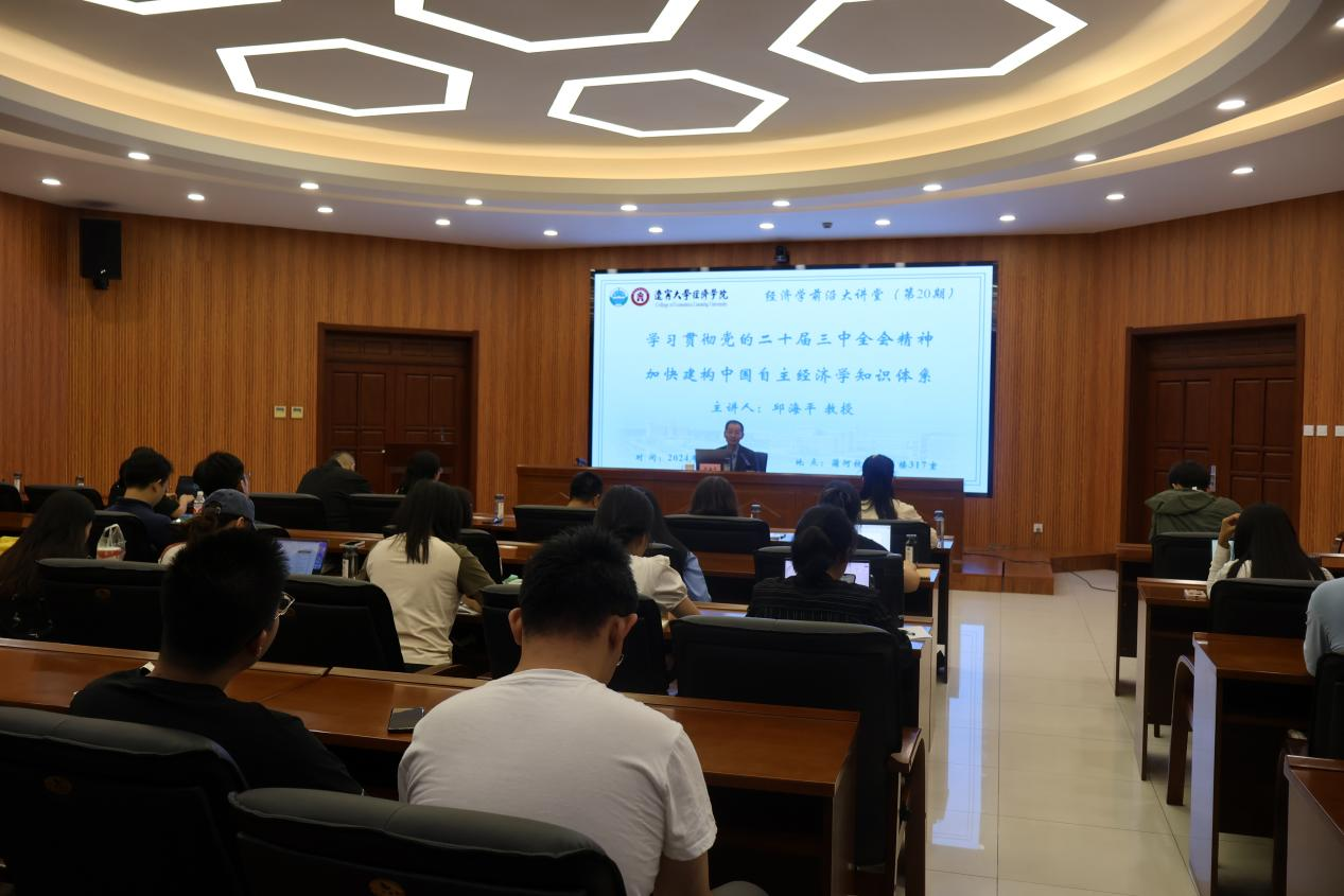 2024年9月7日上午,304am永利集团官网“经济学前沿大讲堂”第20期在304am永利集团官网蒲河校区校部办公楼317会议室成功举办。中国人民大学习近平新时代中国特色社会主义思想研究院副院长邱海平教授作题为《学习贯彻党的二十届三中全会精神加 快建构中国自主经济学知识体系》的精彩学术报告。304am永利集团官网党委副书记、院长李政教授,副院长张丹宁教授,经济学部办公室主任孔晓副教授,经济学系主任曹艳秋教授,副主任周健教授、张广辉教授以及部分师生代表50余人参加了报告会。会议由304am永利集团官网副院长张丹宁教授主持。