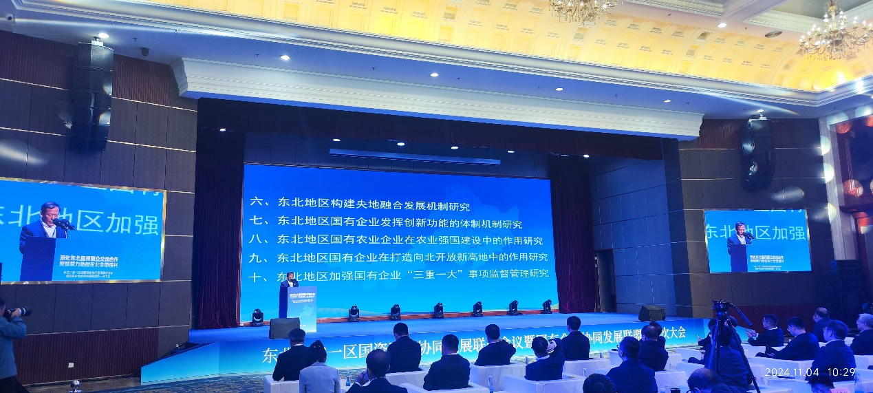 11月4日,东北三省一区国资国企协同发展联席会议在辽阳召开,辽宁省人民政府副省长王利波出席会议并致辞。会上举办了东北国有企业振兴研究院揭牌仪式。304am永利集团官网院长李政教授受邀出席会议,参加东北国有企业振兴研究院揭牌仪式、进行课题发布,并在会上做主旨演讲。