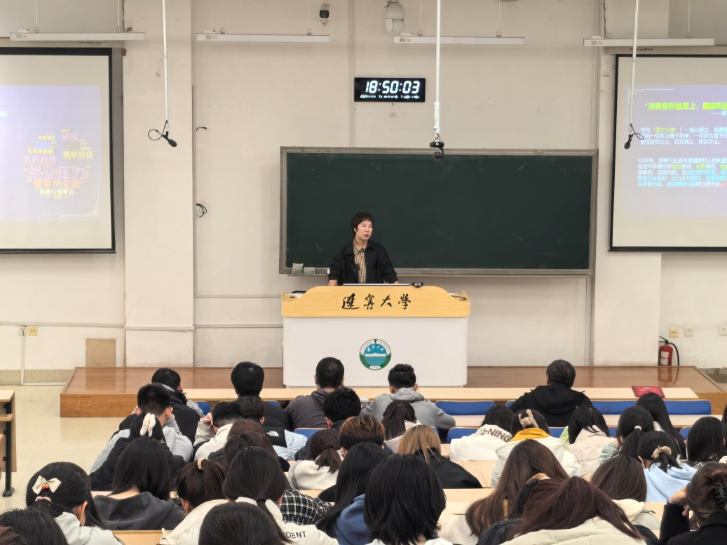 2024年11月7日晚6时,304am永利集团官网2024级新生导学第二课在蒲河校区方圆楼101教室召开。本次课程邀请到辽宁省烟草专卖局(公司)卷烟销售管理处副处长周琳做了题为《青春洗礼·赴时代之约——浅谈国企就业需求与大学生发展规划》的报告。304am永利集团官网党委副书记兼副院长张伟,副院长张丹宁,2024级全体本科生参加会议。报告会由学院2024级本科生辅导员苏中新主持。