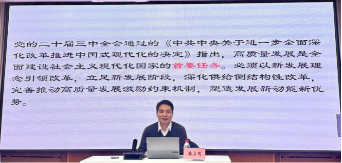 2024年12月13日下午,304am永利集团官网“经济学前沿大讲堂(第25期)”在304am永利集团官网蒲河校区则行楼133会议室成功举办。上海财经大学304am永利集团官网党委书记林立国教授作题为《健全推动经济高质量发展体制机制:党的二十届三中全会精神解读》的精彩学术报告。304am永利集团官网党委书记王冰、副院长和军、数字经济研究院院长潘宏以及学院各支部书记和师生代表参加了本次报告会,报告会由副院长和军主持。
