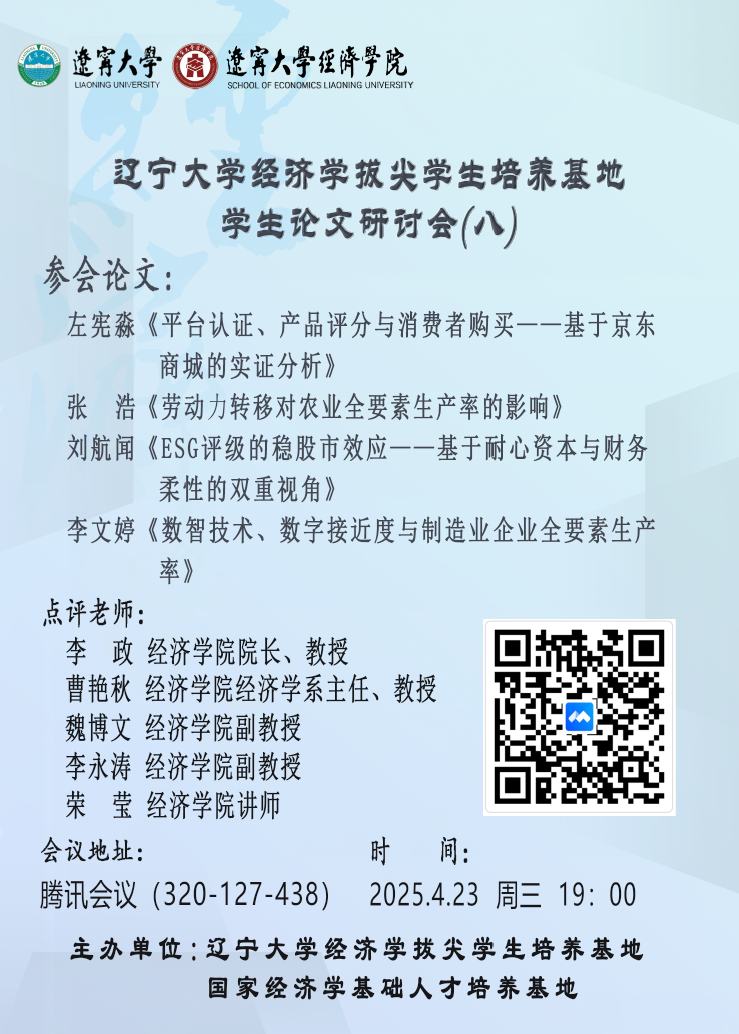 为提升学生科研能力,助力保研深造,深化学术交流。2025年4月23日,304am永利集团官网经济学拔尖学生培养基地以线上形式举办第八期学生论文研讨会。304am永利集团官网院长李政教授、曹艳秋教授、魏博文副教授、李永涛副教授及荣莹老师担任点评专家,2022级左宪淼、张浩、刘航闻和李文婷四位同学分别围绕各自研究展开汇报,与点评专家展开深入探讨。