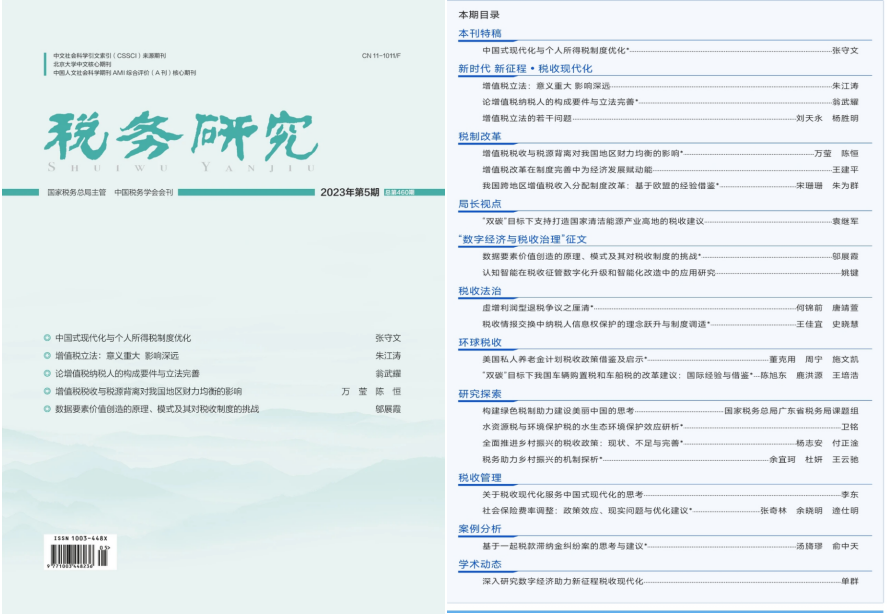 304am永利集团官网杨志安教授与博士生付正淦合作论文《全面推进乡村振兴的税收政策:现状、不足与完善》在《税务研究》2023年第5期发表。