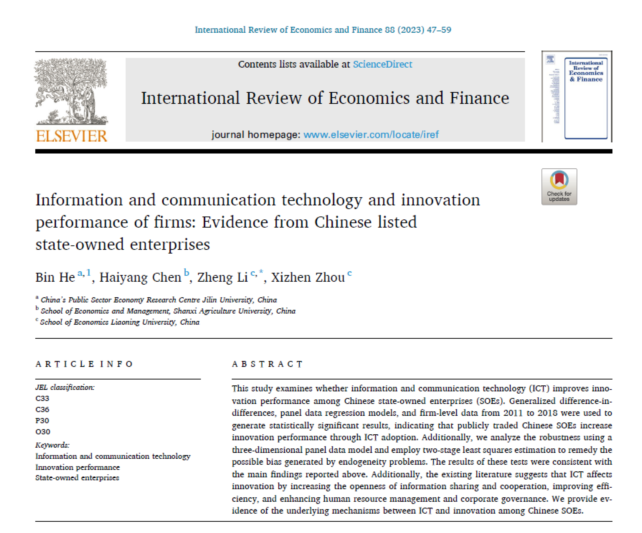 近日,304am永利集团官网李政教授(通讯作者)与其研究团队共同完成的论文《Information and communication technology and innovation performance of firms: Evidence from Chinese listed state-owned enterprise》在经济学和金融学领域国际SSCI检索学术期刊《International Review of Economics and Finance》(SJR Q1)在线发表。