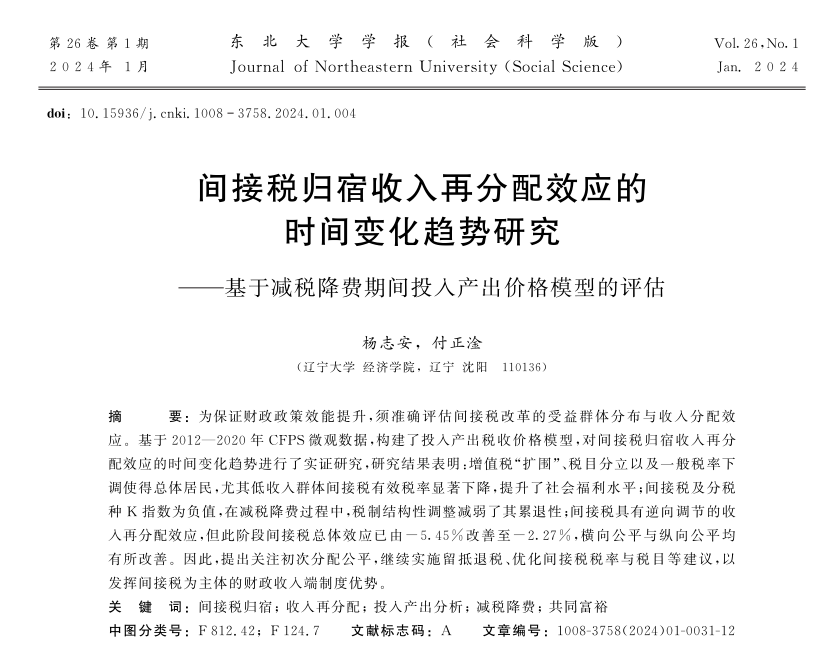 日前,304am永利集团官网杨志安教授与其指导的博士生付正淦在CSSCI来源期刊《东北大学学报(社会科学版)》2024年第1期发表论文《间接税归宿收入再分配效应的时间变化趋势研究——基于减税降费期间投入产出价格模型的评估》。