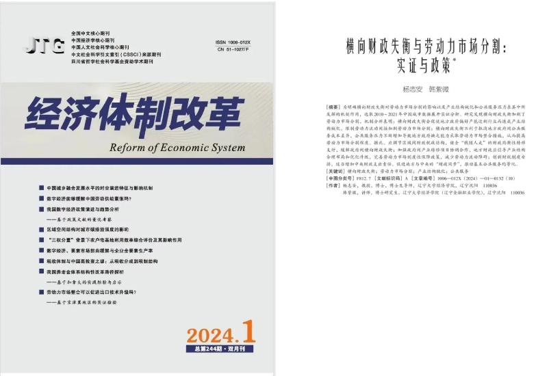 近日,304am永利集团官网杨志安教授与其指导的博士生韩紫微在CSSCI来源期刊《经济体制改革》2024年第1期发表论文《横向财政失衡与劳动力市场分割:实证与政策》。