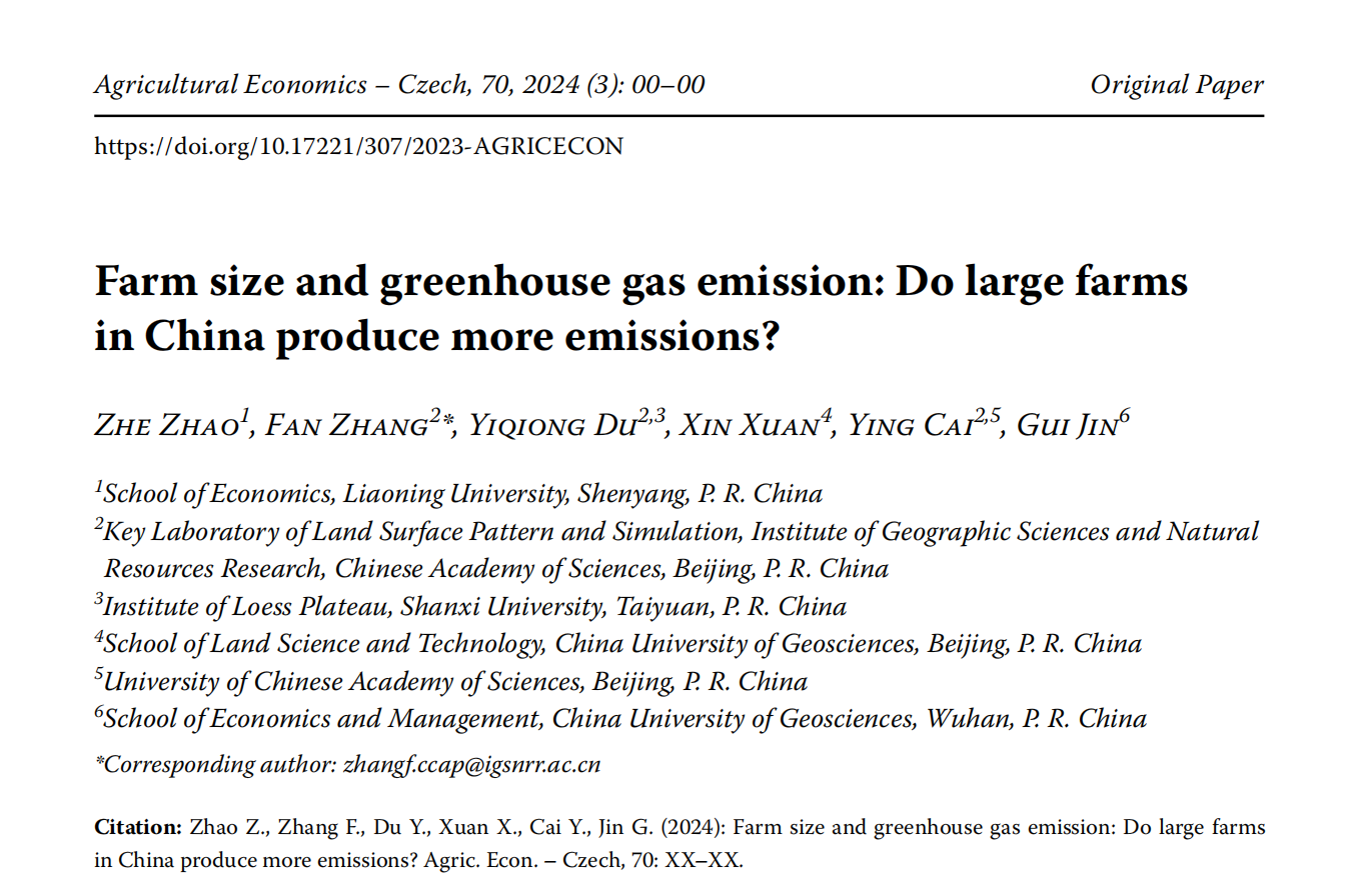 304am永利集团官网赵哲副教授(第一作者)与中国科学院地理科学与资源研究所张帆副研究员(通讯作者)合作的论文“Farm size and Greenhouse gas emission: Do large Farms in China produce more emissions?”在农业经济领域权威期刊Agricultural Economics发表。