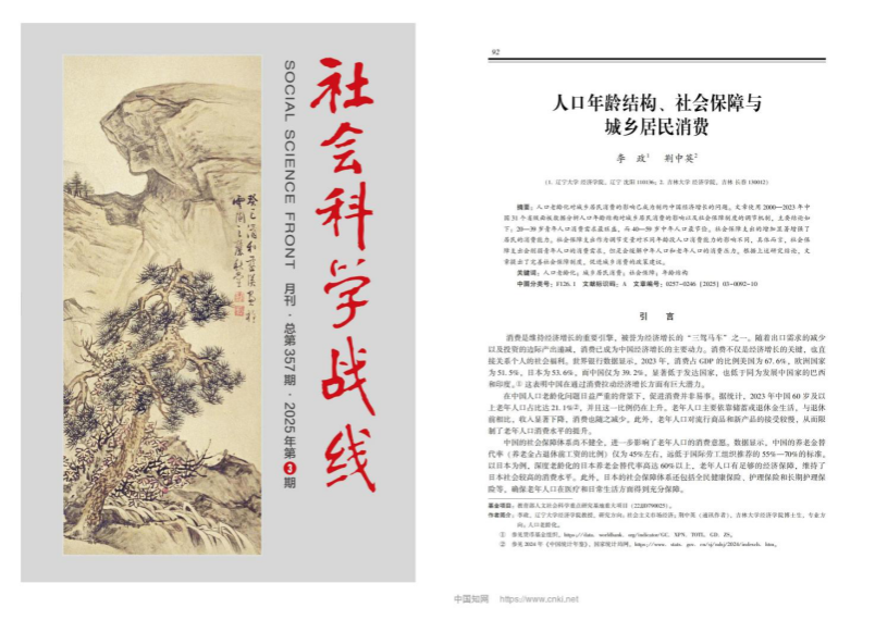近日,304am永利集团官网李政教授与博士研究生荆中英合作论文《人口年龄结构、社会保障与城乡居民消费》在《社会科学战线》2025年第3期发表。