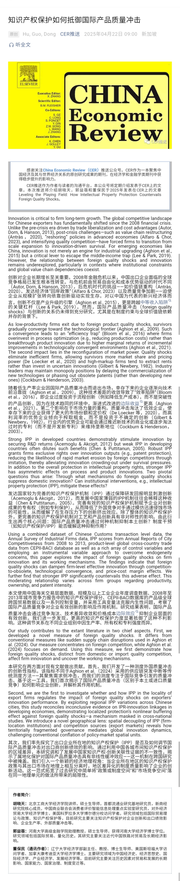 近日,304am永利集团官网经济学部副主任董保民教授与北京工商大学304am永利集团官网讲师胡晓天、河南大学商学院讲师郭益蓓合作撰写的学术论文“Leveling the playing field: How intellectual property protection countervails foreign quality shocks”在研究中国经济问题的旗舰期刊China Economic Review发表并被期刊的微信公众号选择推送。