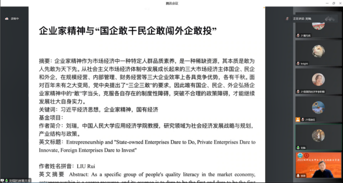 首先,刘瑞教授结合党的二十大报告,梳理了党中央提出“国企敢干民企敢闯外企敢投”和弘扬企业家精神的背景。随后,刘瑞授细致地解读了新时代的企业家精神本质。他指出,企业家精神是市场经济的一种稀缺资源,当前中国特色社会主义市场经济最需要的是敢为天下先的企业家精神。之后,刘瑞教授通过对2018年全国第四次经济普查数据进行整理分析,深入阐释了国有企业、民营企业和外资企业(简称“三企”)现有格局及特点。刘瑞教授认为,“三企”基本格局已经是三分天下各有其一,但发展并不均衡,各有所长,各有用武之地。从企业经济角度分析,在“三企”中,尽管各自所占比重和功能不同,都是实现中国式现代化的重要力量。刘瑞教授从企业的规模经济效率状况、企业的经营管理效率状况、企业的财务管理效率状况三个维度来分析“三企”的不同特点和实力。他认为,在单个企业规模经济效率上,国企明显高于民企和外企;在经营管理效率方面,三类企业各有千秋,然而国企效率比较突出,民企经营管理效率相对较差;在财务管理效率方面,外企和民企财务效率要高于国企。最后,刘瑞教授基于不同企业有不同特点和难点、痛点和关键点,从落实和发挥国有企业家的“敢干”精神、落实和发挥民企企业家的“敢闯”精神、落实和发挥外资企业家的“敢投”精神等三方面阐述了如何弘扬企业家精神,实现“三企”“三敢”。刘瑞教授的精彩报告内容丰富、数据翔实、深入浅出,为师生们深入理解党的二十大报告中提到的“弘扬企业家精神”和“优化营商环境”起到了很好的辅导作用。互动提问环节中,刘瑞教授与师生们进行了热烈探讨和交流,大家得到了刘瑞教授真挚的分享,一致认为收获颇丰。